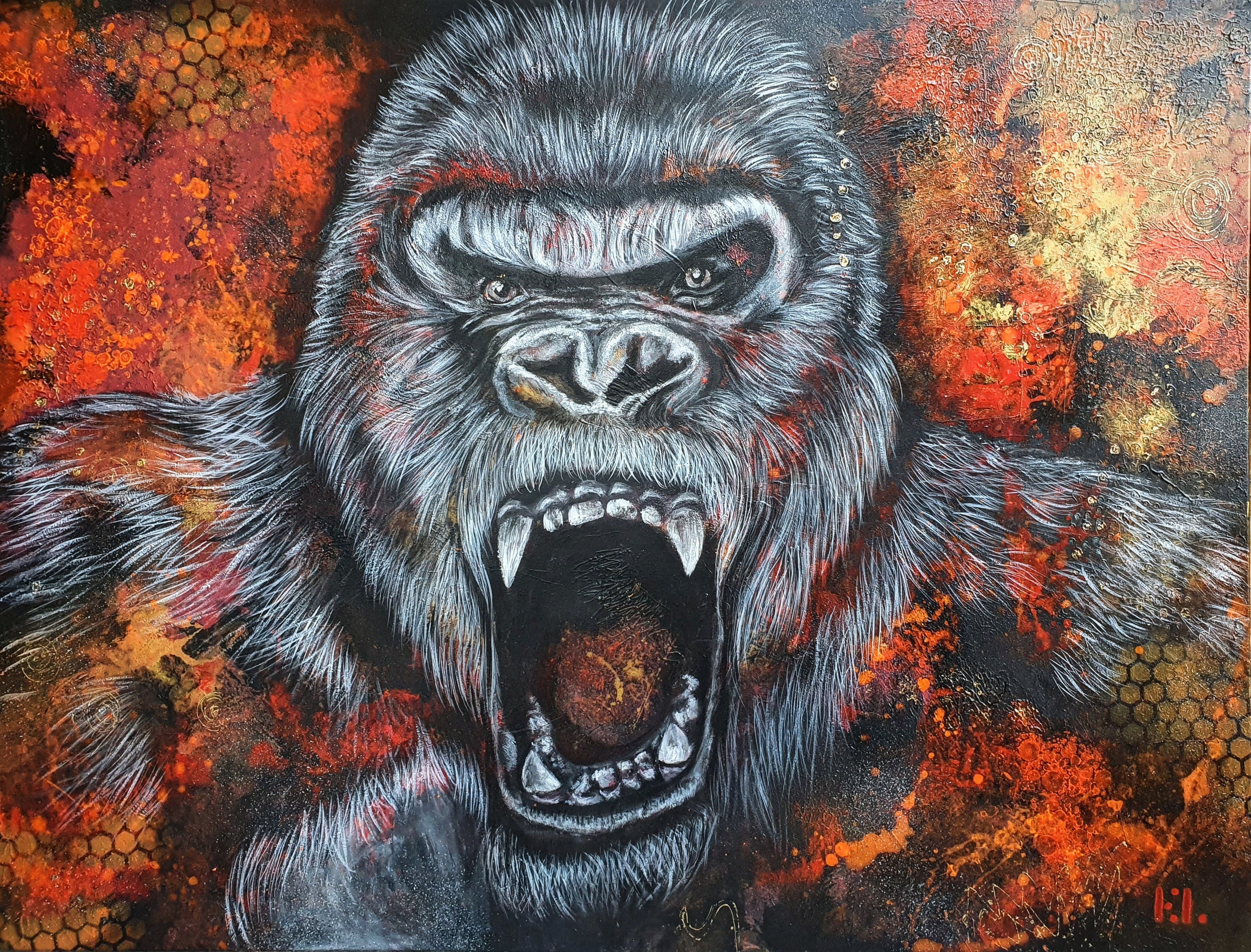 A travers le portrait animalier, Erika Lisch nous invite au voyage chamanique et aux traditions amérindiennes. L’invitation picturale ouvre ainsi la voie aux perceptions sensorielles. Vénéré comme une divinité ou un ancêtre protecteur, l’animal totem est au centre de la recherche artistique d’Erika. L’artiste peint des loups, des ours, des aigles, des félins ou des primates pour leurs attributs sacrés et leur guidance. En fonction des inspirations, ses tableaux sont peints sur papier, toile ou sur panneau de bois MDF. Dans son processus créatif, les effets de gravures sont remarquables. Erika affirme son style en jouant les effets d’ombre et de lumière grâce l’emploi du clair-obscur. On pourrait penser que les tracés ont été réalisés au laser ou par grattages successifs de couleurs. Il n’en est rien.